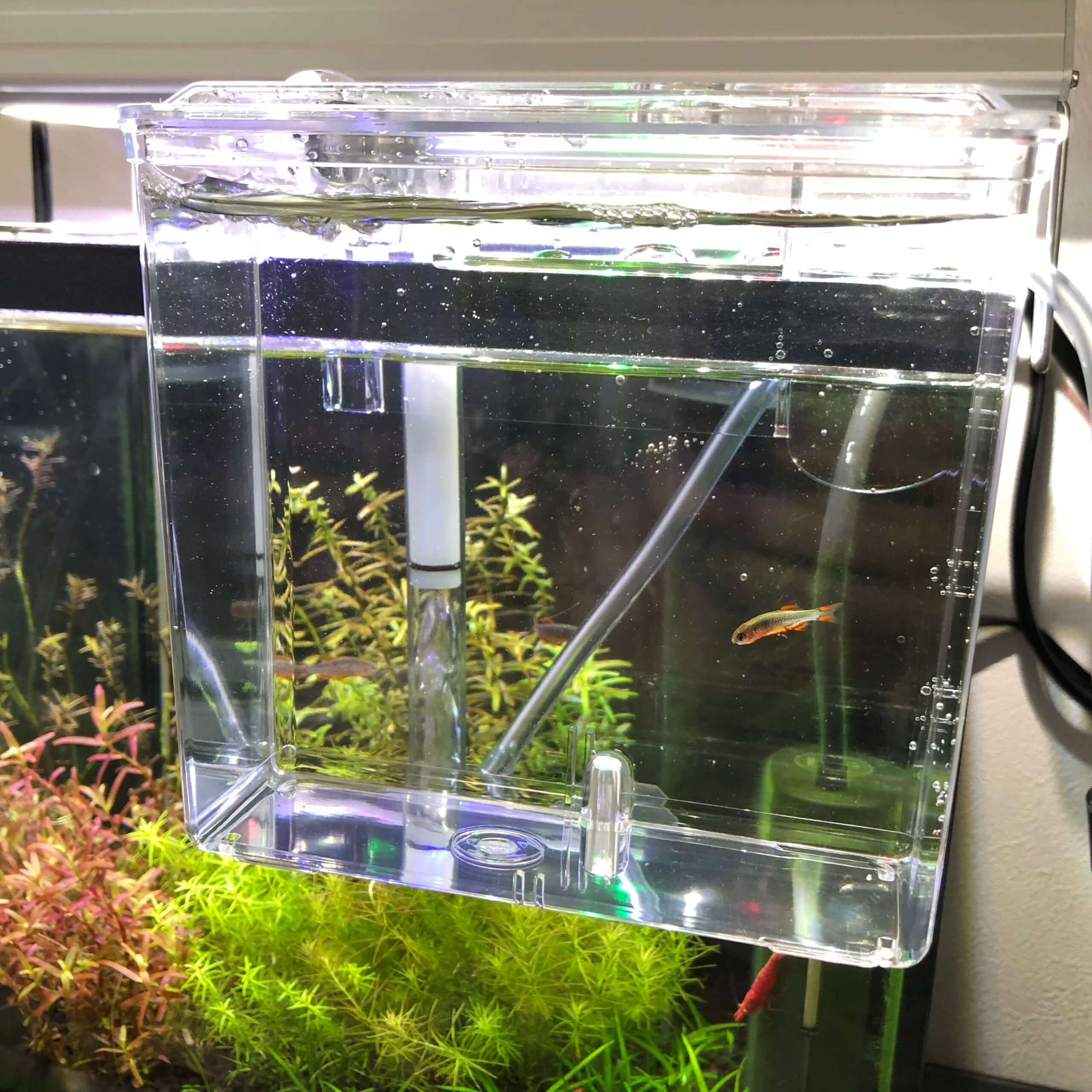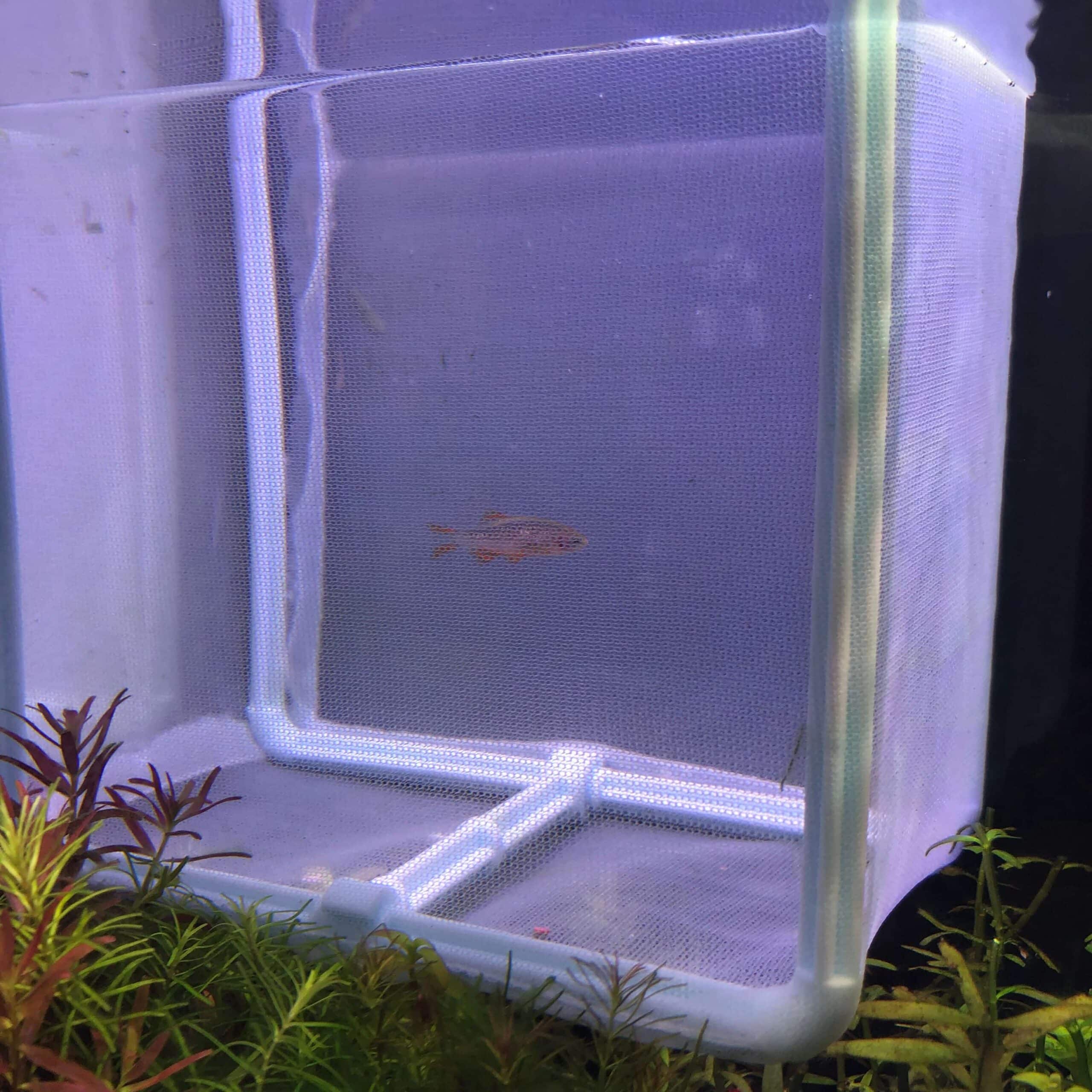 ただ、結果としては上手くいかず、いくら強い個体とはいえミクロラスボラ・ハナビは臆病で群れで行動し水草などに潜み隠れているような種類なので隔離ケースの中は相当にストレスフルな環境だったようで退色薄くなり常に落ち着かないようすで泳ぎ回っていました。