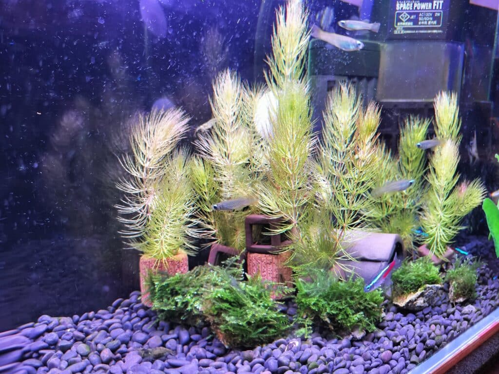 小さい水槽だと不要な栄養素も溜まりやすいので、成長の早い水草はとても有用かとおもいます。ぜひ、小型水槽にはマツモを入れてあげてください。安定しますよ