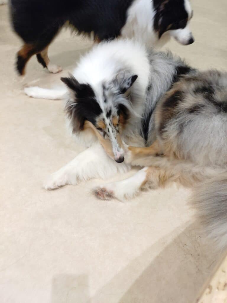 広めのフロアで巨大な犬たちがいます。みんなリラックスしていますね。