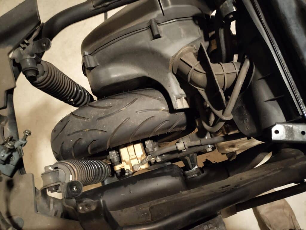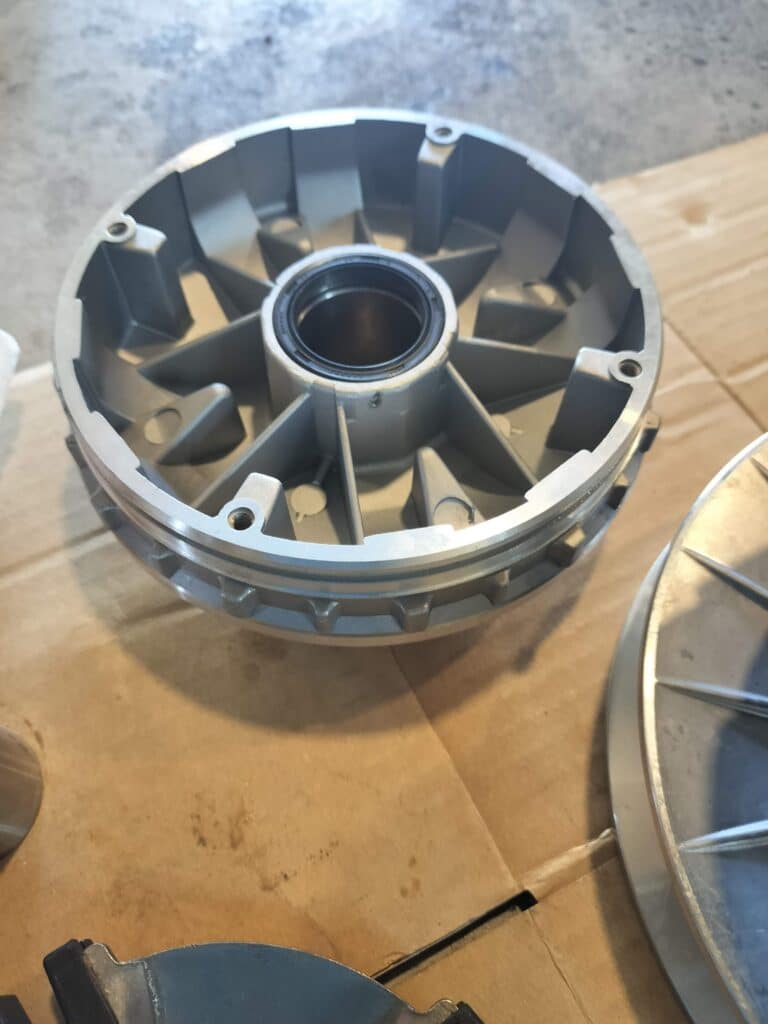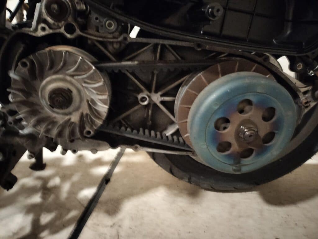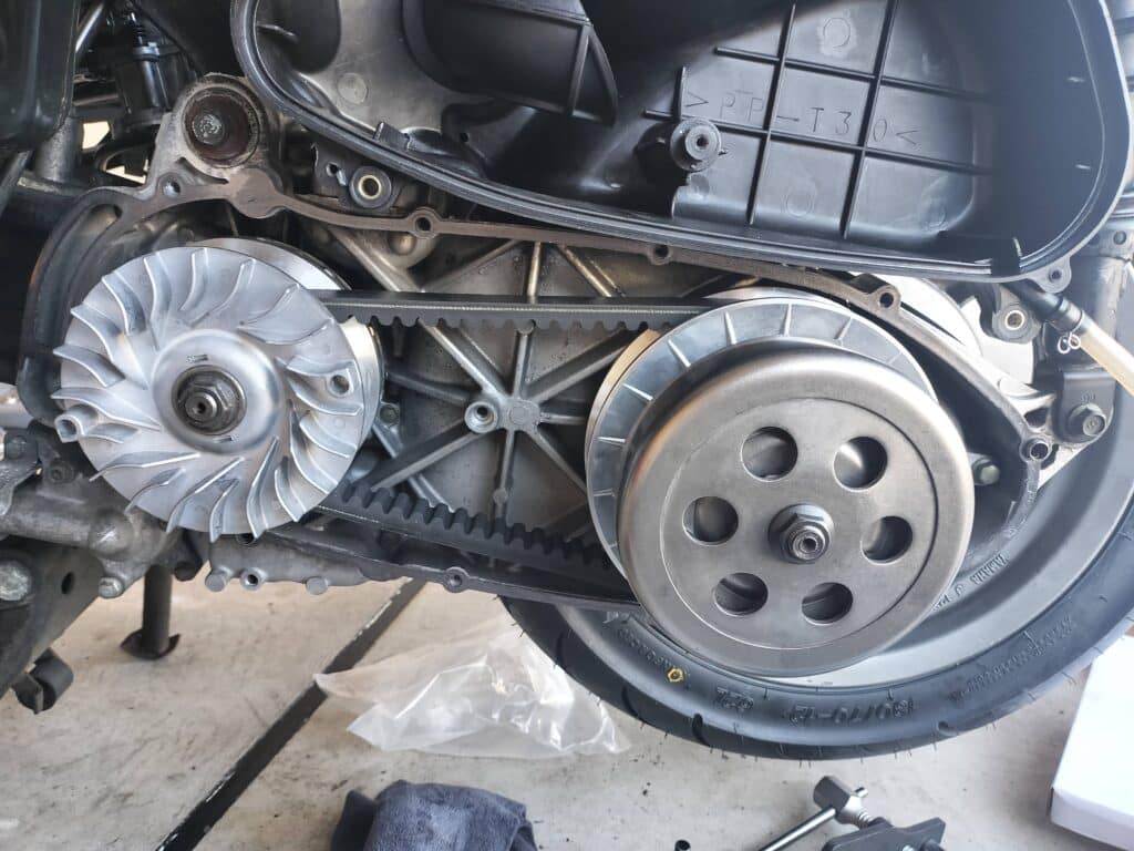交換前はこんな感じでした。クラッチアウターが焼けてしまっているのと、プーリーもウェイトローラー部分が摩耗してへこんでしまったりしていて、良くない状態でした。大体5万キロ経過した状態です。