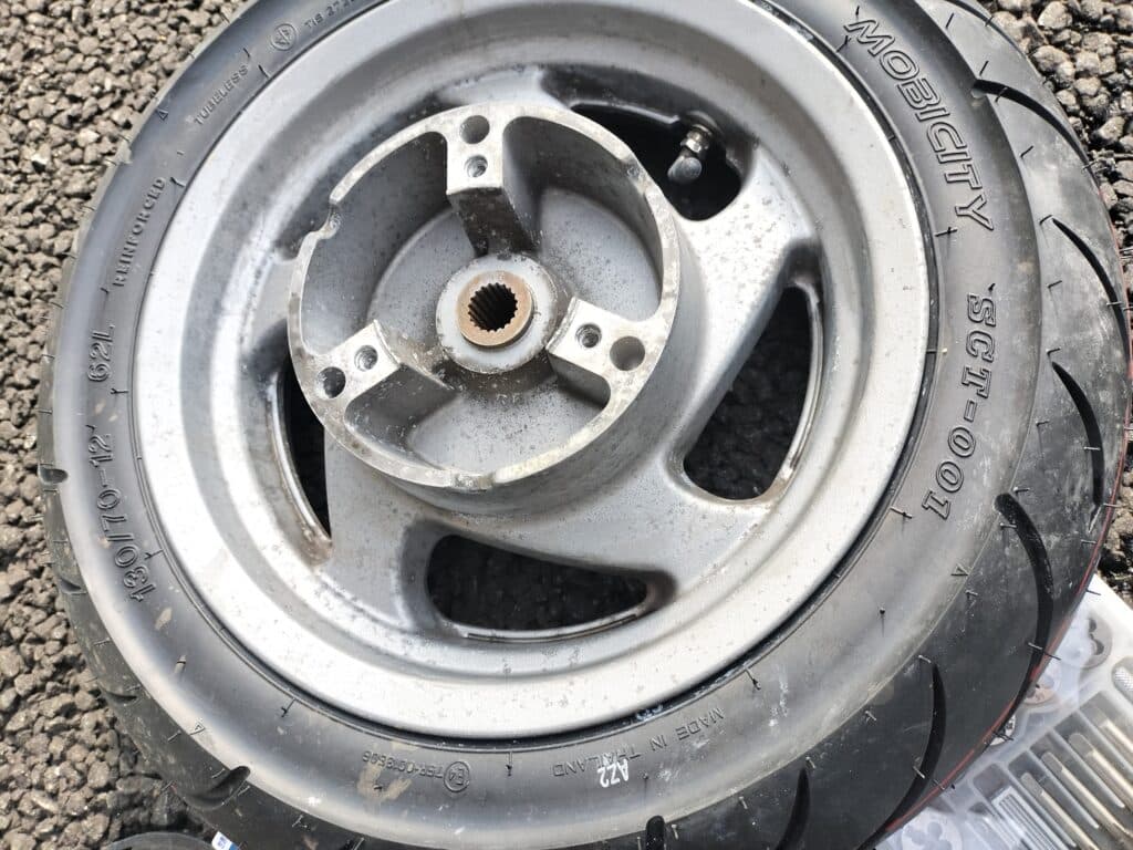 掃除前は汚い。タイヤも減っていたので新品に交換。