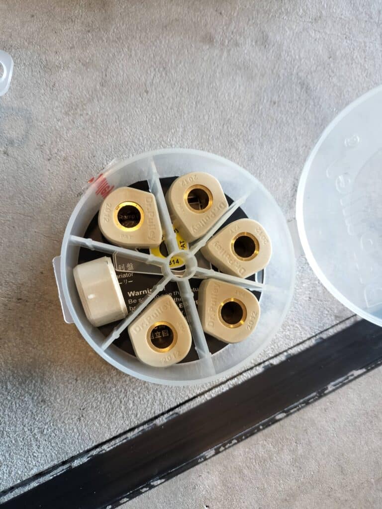 こちらはドクタープーリーのものを購入しました。通常のウェイトローラーではなく、変わった形のウェイトローラーです。純正は一個の重さが18gですが、16gにしました。