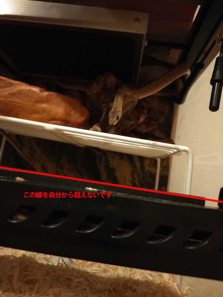 にょろにょろして、外に出たそうにしていることがあるので、ドアを開けてあげるのですが、逃げません。この、ケージの敷居の部分を越えようとしない感じです。ちょっとだけはみ出すくらいです。