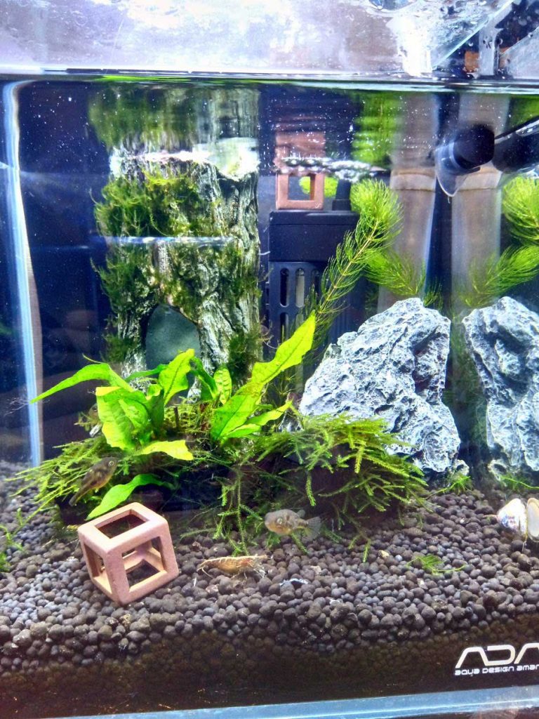 なるべくシンプルに、機材を水槽内に入れないようにする。掃除もしやすくするために、レイアウトも動かせるように配置。まめに掃除する。